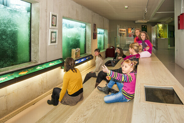 in RheinauWilde Fische in freier Natur beobachten ist in der Fischtreppe möglich. Der Besucherraum gibt Einblick unter das Wasserniveau und auf das Wasser.