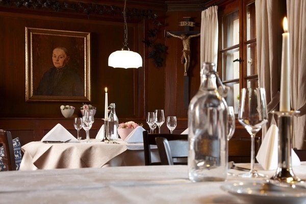 unseren Gaststuben | Nehmen Sie unser Viergang-Abendmenü nicht in Anspruch, schreiben wir Ihnen pro Person/Abend 15,– Euro auf der Zimmerrechnung gut | Grander-Quellwasser steht im ganzen Haus zur Verfügung.