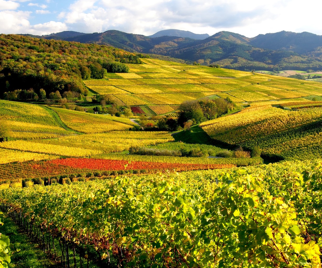 Blick vom Kirchberg über die herbstliche Reblandschaft des südlichen Schönberggebiets bei Ehrenkirchen  (Bildnachweis: Copyright und Fotograf: Th. Coch)